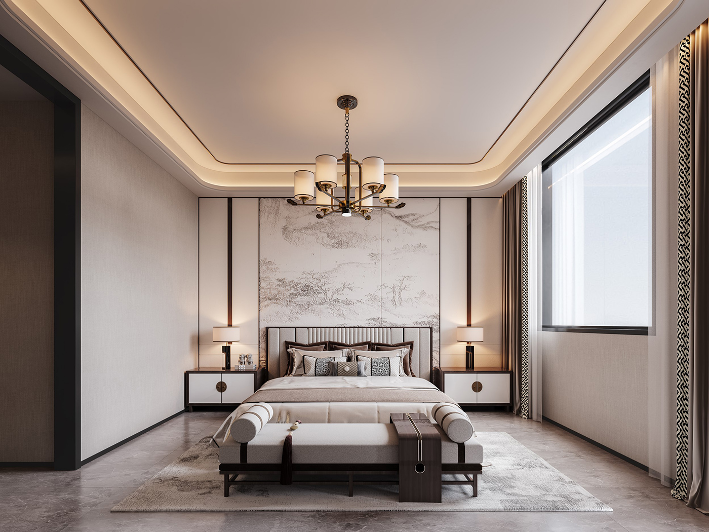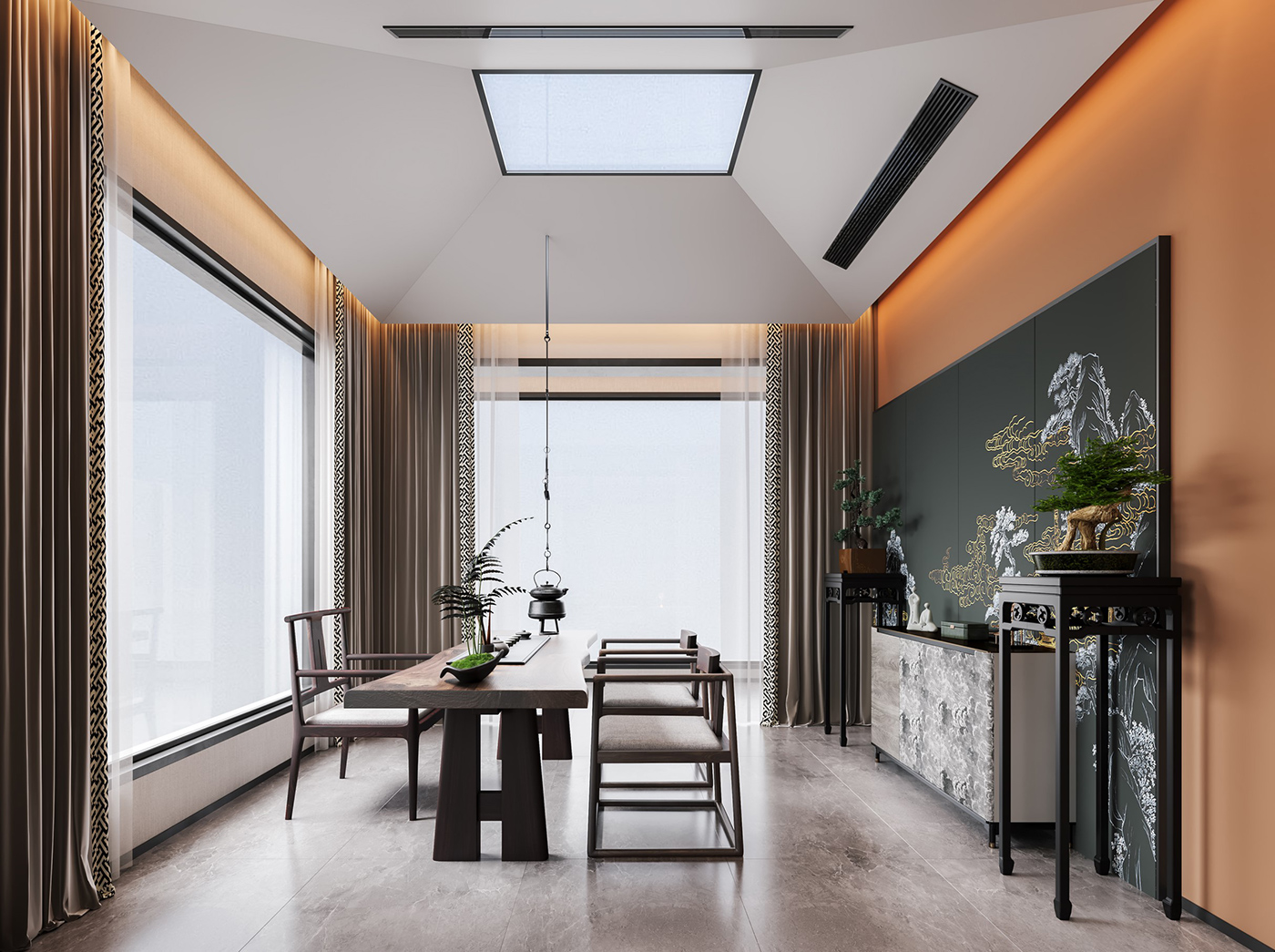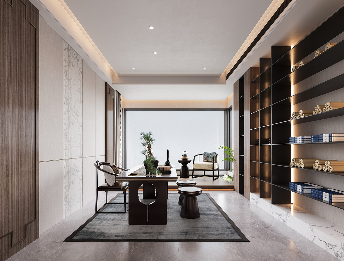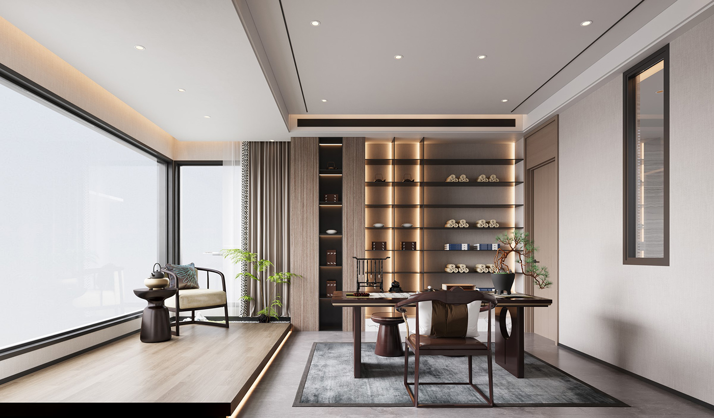木纹材质与山水画等设计元素通过现代的手法和形式举行处置惩罚,,,,,,配合新型材质与灯光的打造,,,,,,营造山水之间,,,,,,心之所往的静谧空间。。。。。。。 金属元素与艺术感岩板搭配,,,,,,材质比照,,,,,,让整个空间眼前一亮。。。。。。。