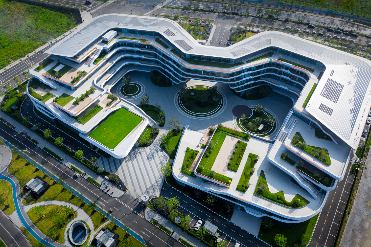 园区由6个修建主体组成,,,,,展现出“如意协调、聆听未来、探索未知”的设计看法。。。。。。四栋研发办公主楼形如对称的“耳朵”,,,,,寓意“聆听未来”,,,,,划分为“A1楼、A2楼、A3楼和A4楼”。。。。。。