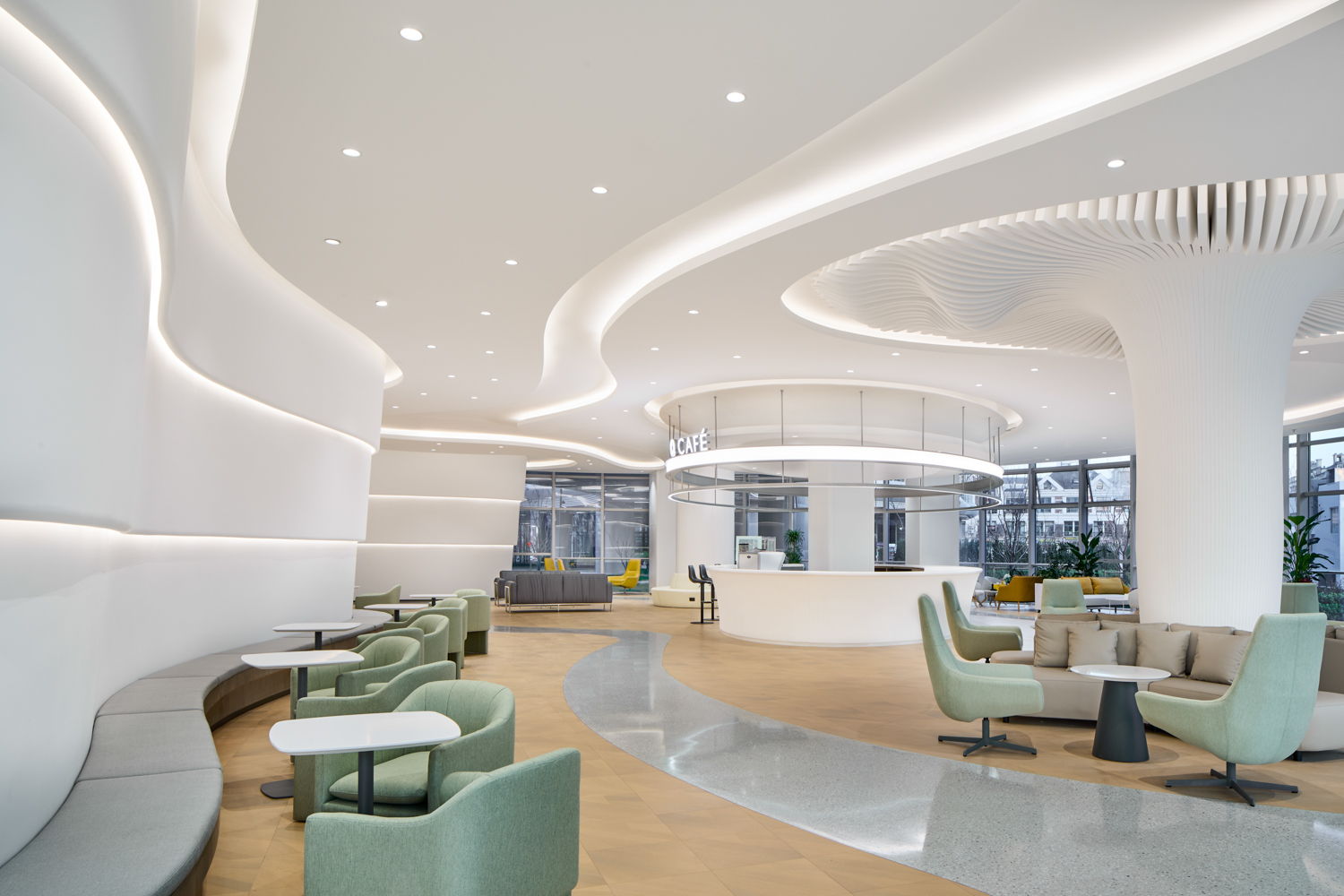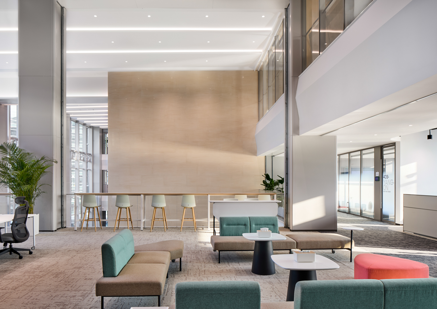 移远全球中心总修建面积10.23万㎡,,,,,,,伟德官网承接了室内设计及精装修施工。。。。。室内空间以谦逊而开放的姿态,,,,,,,将移远品牌视觉语言笼统转译,,,,,,,化为可触摸的、有温度的诗篇。。。。。