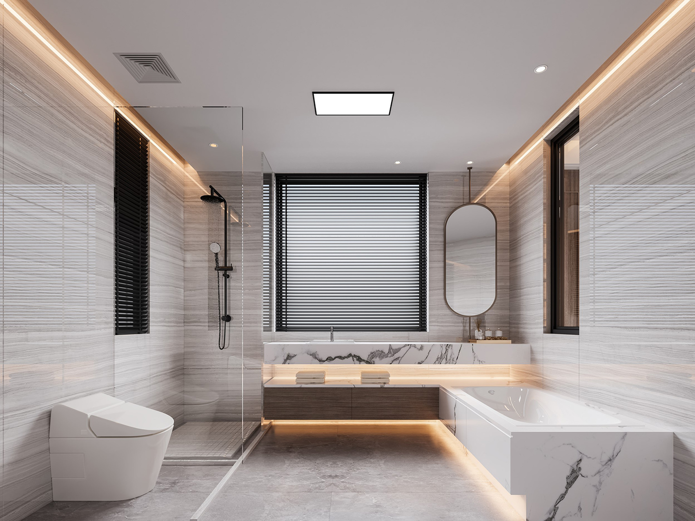 木纹材质与山水画等设计元素通过现代的手法和形式举行处置惩罚,,,,,,配合新型材质与灯光的打造,,,,,,营造山水之间,,,,,,心之所往的静谧空间。。。。。。。 金属元素与艺术感岩板搭配,,,,,,材质比照,,,,,,让整个空间眼前一亮。。。。。。。