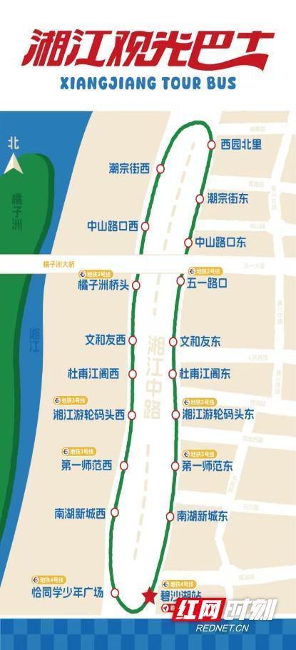 湘江不雅光巴士共设站点19个,串联“四大历史文化街区(历史地段)”(西园北里、潮宗街、太平街、西文庙坪)、“四大文旅热门”(橘子洲、杜甫江阁、贾谊故园、湘江游轮)、“两大红色场景”(第一师范、恰同学少年广场)、“三大热门营业”(五一商圈、文和友、碧湘楚巷)、“三地面铁澄莹”(地铁2号线、3号线、4号线)等进犯节点,沿湘江中路双向对开初始。