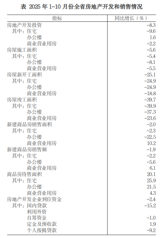 1-10月份,全省新建商品房销售面积同比下跌2.0%。其中,住宅销售面积下跌2.3%。全省新建商品房销售额下跌1.9%。其中,住宅销售额下跌2.2%。