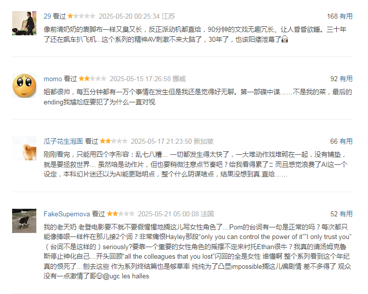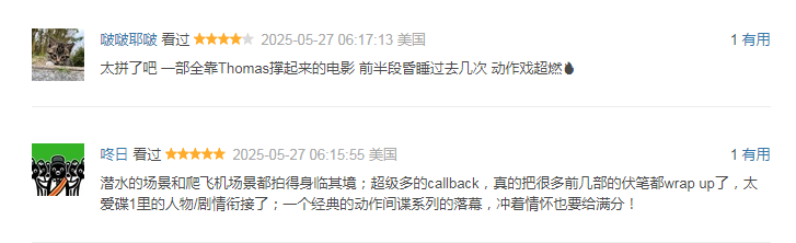 先看豆瓣首页当场推送的五条热评,四条IP都在异邦,其中一条四星磋议,昭彰是系列的铁杆粉丝,能明晰鉴识《碟中谍2》的元素莫得出目下电影里,以致能看出扒飞机的段落中,漂荡员的色彩和和第六部漂荡员的色彩一模一样。同期讴歌“阿汤哥时局活在线,陆续上天入海,挑战极限,奉献视觉盛宴。在这个流媒体逐渐成为主流不雅影形状的今天,仍然有电影解释了大银幕的不可替代性。”