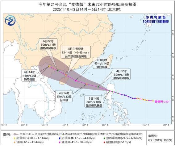 r最新预告表示,瞻望“麦德姆”穿过菲律宾吕宋岛后,将于3昼夜间移入南海东部海面,之后向西朔标的出动,强度渐渐增强,最强可达强台风级(14~15级,42~48米/秒);并将于5日白昼在广东电白到海南万宁一带沿海登陆(台风级或强台风级,13~14级,40~45米/秒),登陆后强度渐渐收缩。中央表象台已于3日上昼发布台风黄色预警。